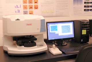 We also have a Thermo Scientific iN10 FTIR microscope, equipped to measure transmitted and reflected light spectra from ~0.9 - 25 µm, with spot sizes ranging from ~10 - 300 µm.  Automated mapping is enabled via a motorized sample stage.  The µ-FTIR has two detectors, an uncooled DTGS and a cooled, wide-band MCT.  The DTGS detector allows analysis of samples without the hassle of liquid nitrogen (good for single analyses or small numbers of analyses), and the MCT detector allows more rapid data acquisition (useful for mapping).
